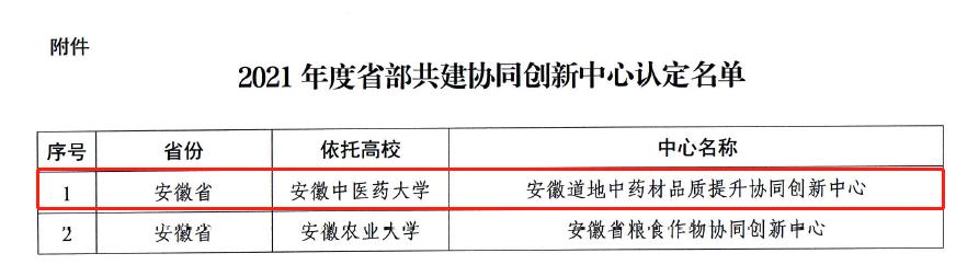 近日,教育部办公厅印发《关于认定2021年度省部共建协同创新中心的通知》(教科信厅函[2022]4号),公司申报的“安徽道地中药材品质提升协同创新中心”被教育部认定为省部共建协同创新中心。