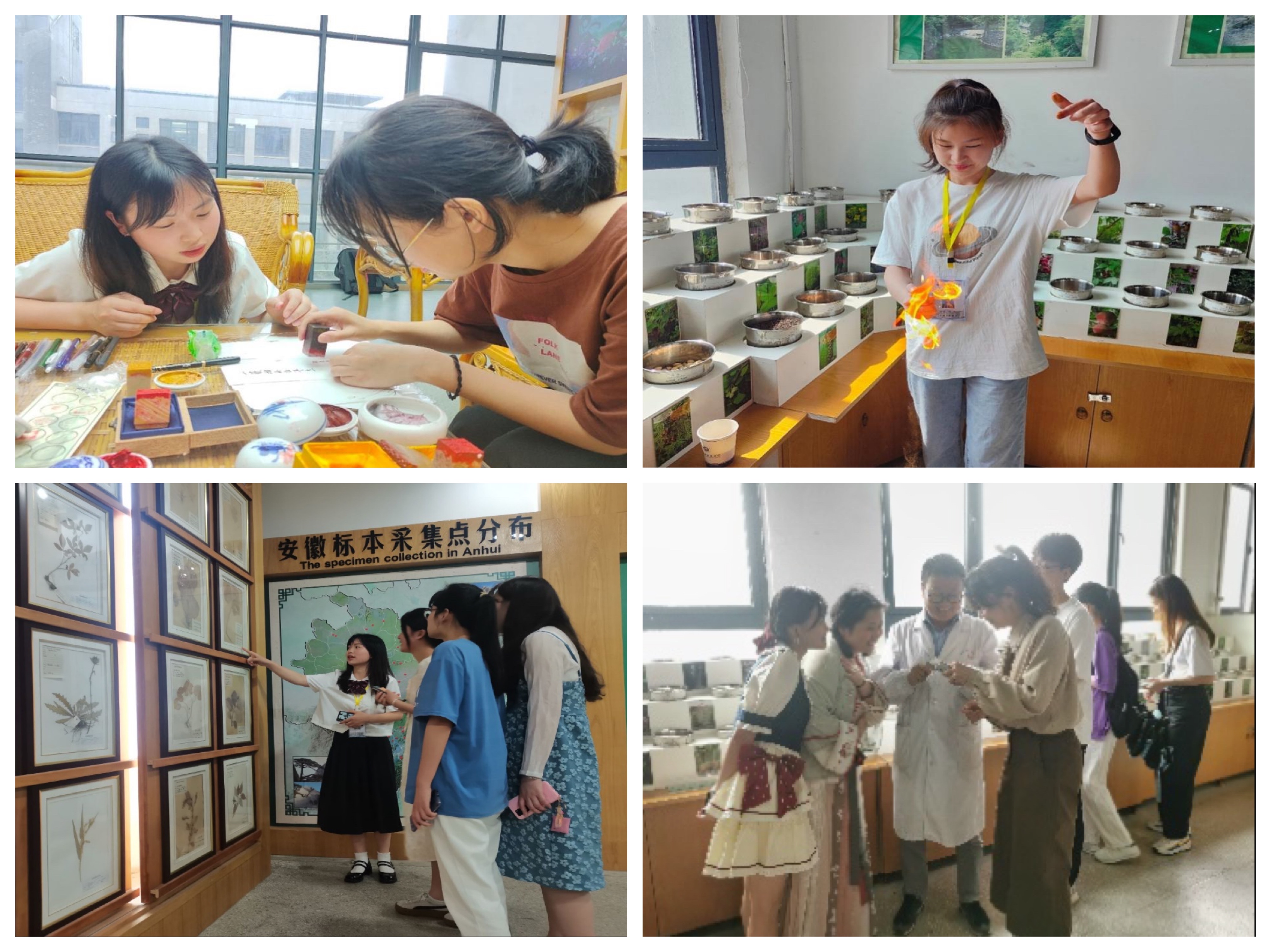 讲解员们认真细致对中药资源中心六大馆依次展开介绍,生动诙谐地向同学们说明部分常见药用植物的品种、特点、功效以及用途。为增加活动趣味性,本次活动同时增设DIY文创设计区,提供中药题材宣纸、手工印章印泥、书法笔等物品。讲解员们带领大家认真学习书画印章使用方法,同学们不仅掌握了专业知识,而且体会到动手制作的乐趣。师生共同参与其中,一起设计心仪的中药宣纸笺。