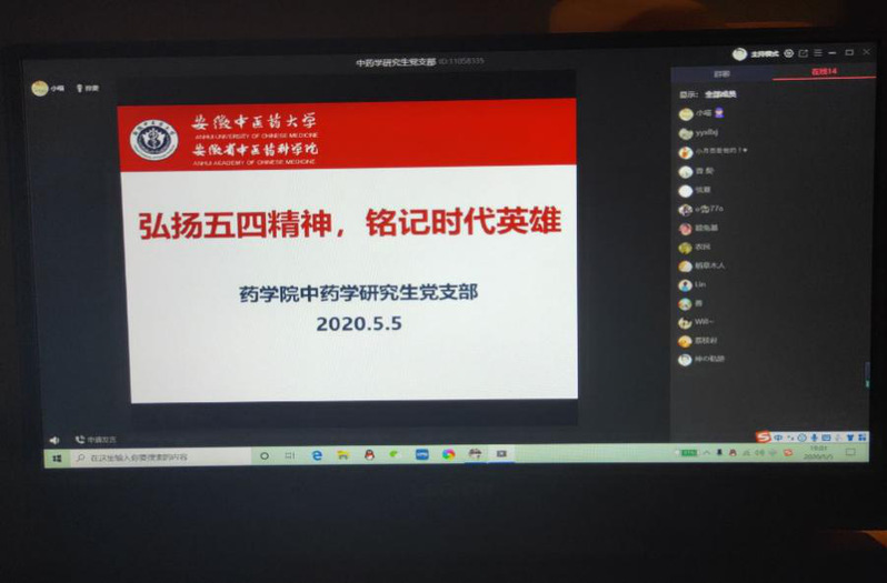5月5日晚19:00,TapTap点点中药学研究生党支部通过腾讯群课堂开展了以“弘扬五四精神,铭记时代英雄”为主题的线上党课,党课由支部书记欧美凤主持,全体支部成员参加。