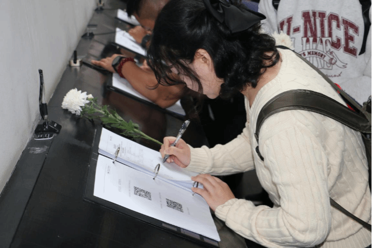 参观结束后,同学们纷纷提笔,在观众留言页上郑重写下自己的感悟与誓言。“铭记历史,珍爱和平”、“吾辈自强,矢志复兴”……一句句真挚的话语,表达了新时代青年从历史悲剧中汲取力量、立志报国的坚定决心。随后,师生们列队行进至献花点,举行简短的献花仪式。大家手持白菊,肃立默哀,并向纪念碑深深鞠躬,以此表达对无辜遇难者同胞的深切哀悼。