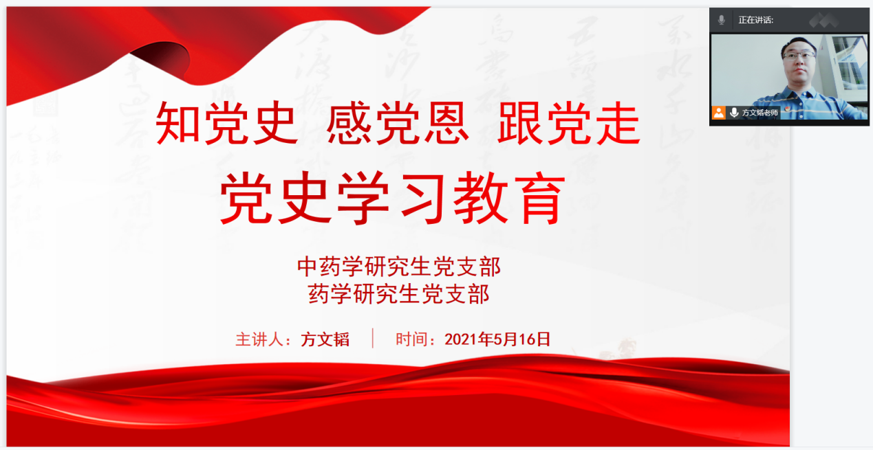 胸怀千秋伟业,恰是百年风华。2021年是中国共产党成立100周年,在庆祝中国共产党百年华诞的重大时刻,在“两个一百年”奋斗目标历史交汇的关键节点,全党集中开展党史学习教育,正当其时,十分必要。TapTap点点中药学研究生党支部、药学研究生党支部积极响应党中央关于党史学习教育的号召,于5月16日下午组织开展了“知党史,感党恩,跟党走”党史学习教育党日活动。因受疫情影响,在当前全国上下众志成城、坚决打赢疫情防疫阻击战的情况下,此次活动采用线上会议的形式展开,中药学研究生党支部、药学研究生党支部全体党员参加此次活动。