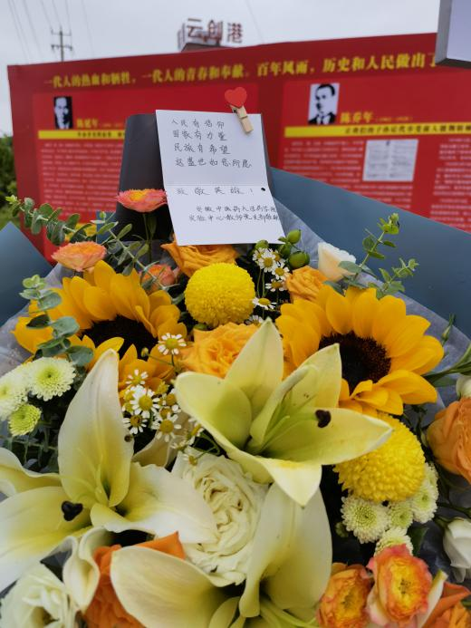 在两位烈士的光荣事迹展板前,彭灿同志向烈士敬献了鲜花。而后,全体党员向着堆满鲜花的光荣事迹展板三鞠躬,缅怀革命先烈。紧接着,彭灿带领全体党员同志庄严地重温了入党誓词。随后,安徽革命烈士事迹陈列馆“95后”讲解员张道鑫,为我们讲述了两位青年革命者的英勇事迹。