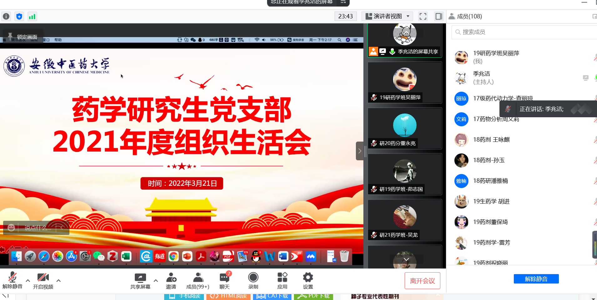 3月21日下午,TapTap点点药学研究生党支部以线上会议的形式召开2021年度基层党支部组织生活会暨开展民主评议党员活动。会议由药学研究生党支部书记季兆洁主持。