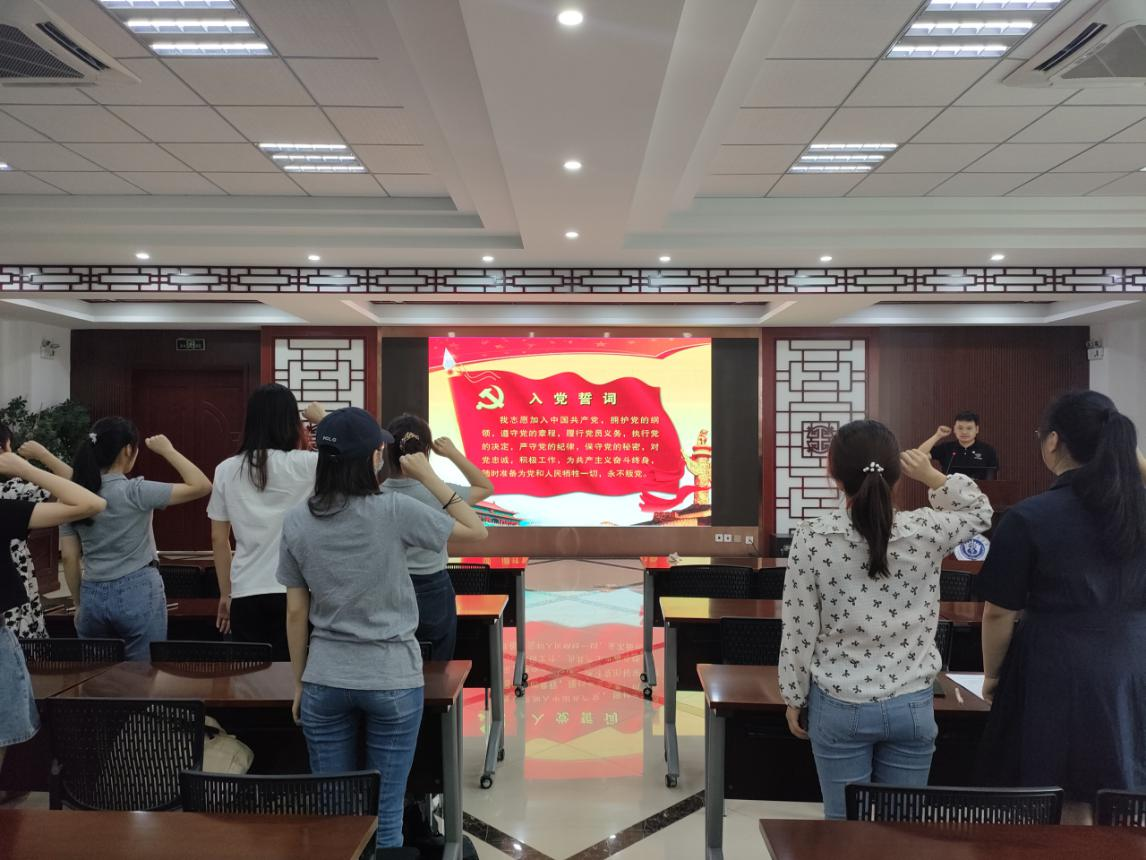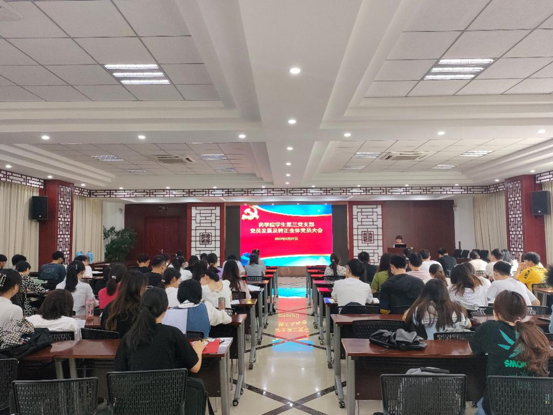 大会第一部分党员发展。会议开始,全体起立,奏唱《中华人民共和国国歌》。而后,吴婷婷等19名党员发展对象逐一向党组织汇报自身对党的认识、入党动机、本人履历、家庭和主要社会关系情况。随后,由相应入党介绍人向大会介绍其主要政治思想、学习、工作生活等情况,并对其能否入党表明意见。紧接着,支部教师党员王艺伟报告党员发展对象现实表现的考察情况以及综合政治审查情况,与会正式党员对发展对象是否符合党员条件发表意见。经拥有表决权的正式党员对是否接受预备党员依次进行无记名投票,最终同意吴婷婷等19名发展对象正式成为中共预备党员,由入党介绍人为新发展预备党员佩戴党员徽章、合影留念,并在王艺伟老师的带领下庄严宣誓。