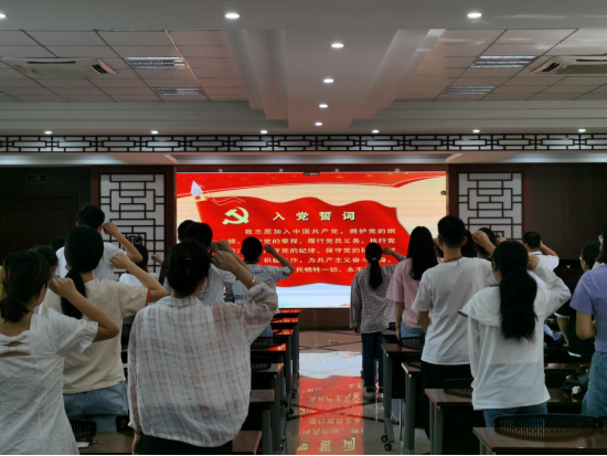 大会伊始,全体起立,奏唱《中华人民共和国国歌》。随后,卢孟雅等9名党员发展对象依次向党组织汇报自身对党的认识、入党动机、本人履历、家庭和主要社会关系情况,并由相应入党介绍人向大会介绍其主要政治思想、学习、工作生活等情况,并对其能否入党表明意见。支部委员会报告发展对象的审查情况,与会正式党员对发展对象能否入党进行充分讨论,经投票表决,一致同意卢孟雅等9名同志成为中共预备党员。方文韬同志代表支部宣布了决议。入党介绍人为新发展的预备党员佩戴党员徽章,预备党员在党支部副书记刘燚带领下庄严宣誓。