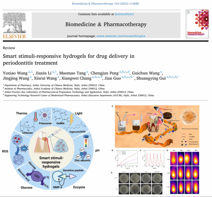 此外,桂双英教授和郭健副教授基于课题组多年基础,近日在《Biomedicine & Pharmacotherapy》(中科院药学一区TOP,IF=7.5)发表了题为“Smart stimuli-responsive hydrogels for drug delivery in periodontitis treatment”综述,系统总结了递送牙周炎治疗药物的智能水凝胶设计与构建思路。智能响应水凝胶根据外部与内部刺激响应的不同,有温度、pH、光、ROS、葡萄糖、酶等响应水凝胶。该综述还分析阐述了智能水凝胶在消除牙周致病菌、调节牙周炎症微环境和加速牙周组织再生等方面的优势及发展展望。论文以TapTap点点官方网站为第一通讯单位,第一作者为TapTap点点官方网站2023级博士研究生王雨宵和2021级硕士研究生李佳鑫。原文链接:https://doi.org/10.1016/j.biopha.2023.114688。