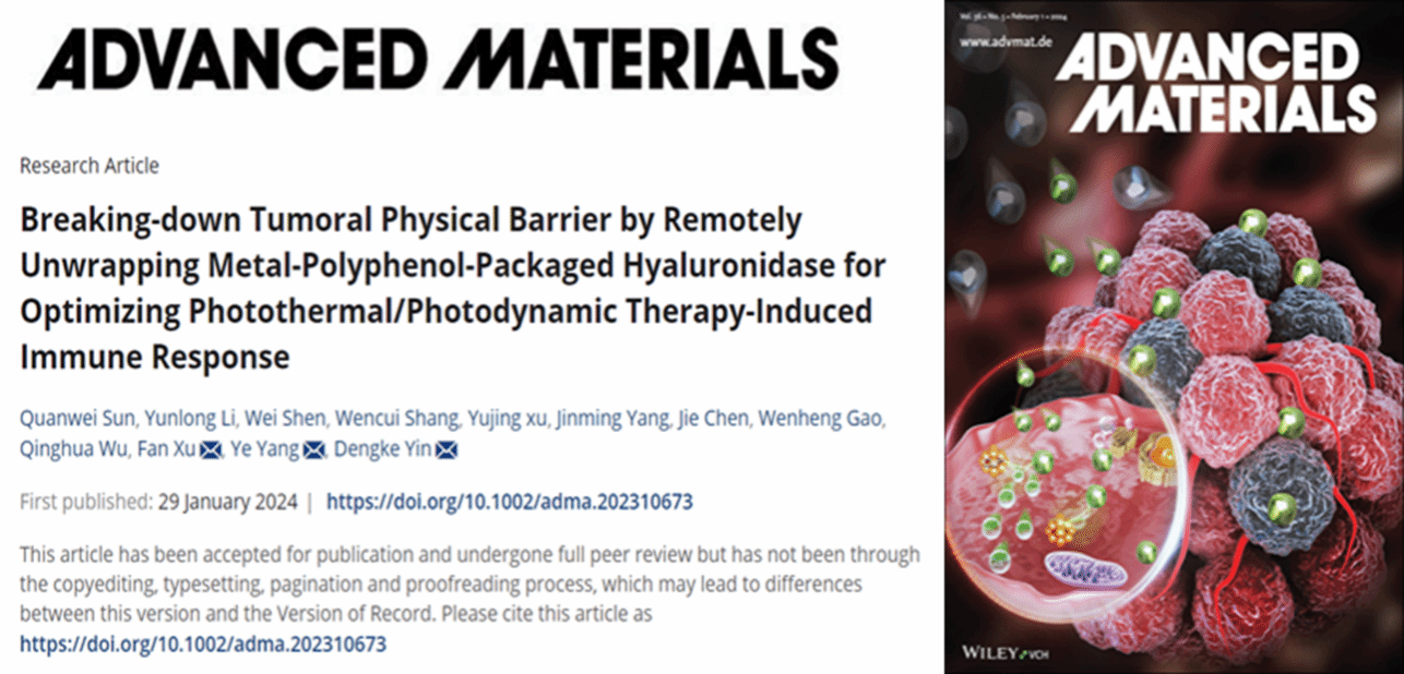 近日,TapTap点点许钒教授、杨晔教授和尹登科教授合作,基于中药活性成分五没食子酰葡萄糖(PGG)设计了一种可控释放的金属-多酚网络作为大分子给药策略,研究成果发表在国际材料学权威期刊《Advanced Materials》(影响因子:29.4)。论文题目为”Breaking-down Tumoral Physical Barrier by Remotely Unwrapping Metal-Polyphenol-Packaged Hyaluronidase for Optimizing Photothermal/Photodynamic Therapy-Induced Immune Response”,博士研究生孙全威、硕士研究生李云龙、沈伟研究员为并列第一作者,TapTap点点官方网站为该论文的第一单位和唯一通讯单位。《Advanced Materials》是自然指数期刊,是国际最具影响力的顶级期刊之一。
