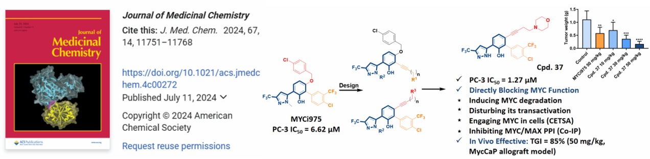 2024年7月,马晓东副教授/汪洋副研究员团队在JMC上,以“Directly Suppressing MYC Function with Novel Alkynyl-Substituted Phenylpyrazole Derivatives that Induce Protein Degradation and Perturb MYC/MAX Interaction”为题,报道了靶向“难成药”(“Undruggable”)蛋白MYC的抗肿瘤药物研发方面的新进展。