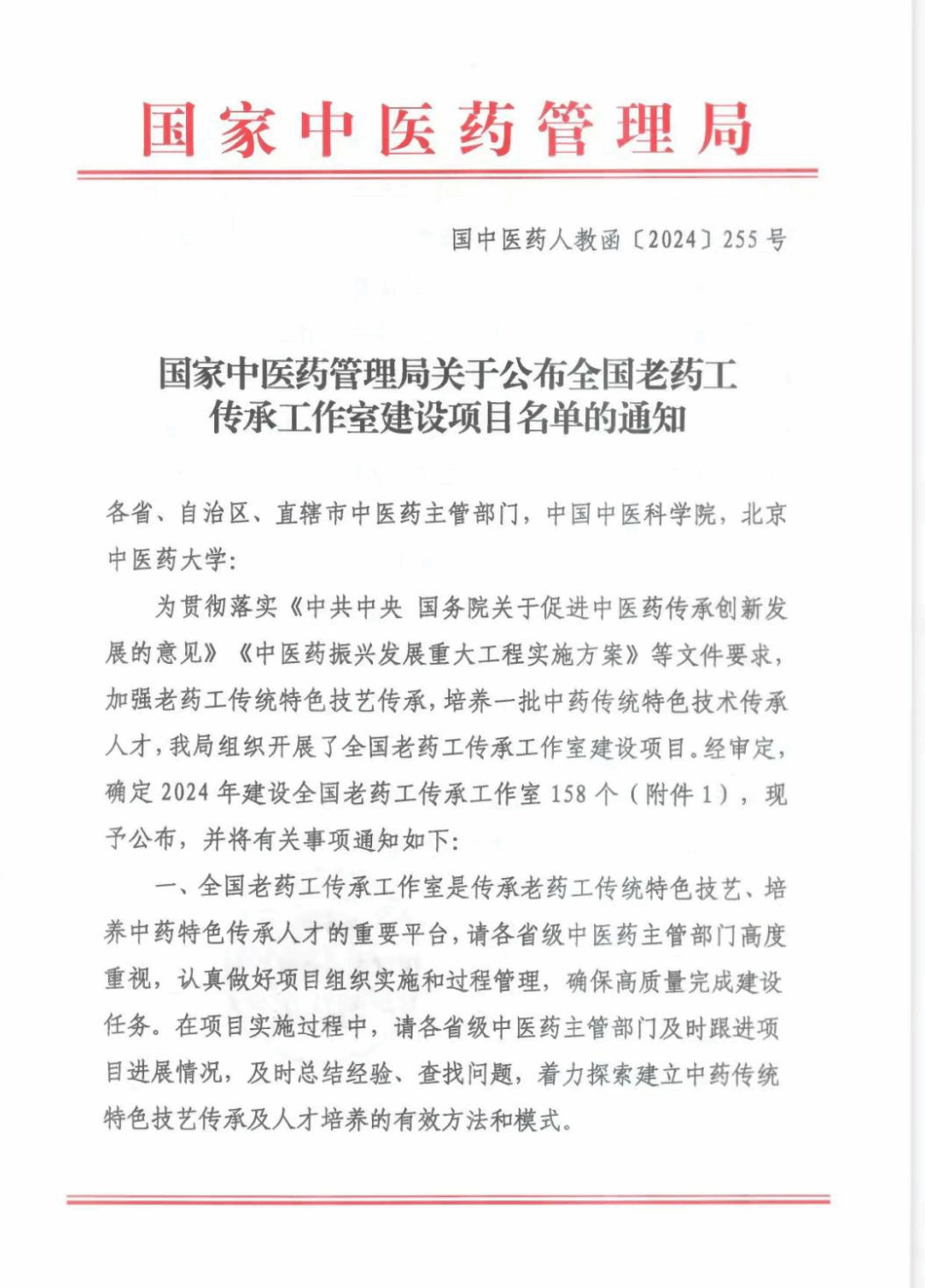 11月29日,国家中医药管理局公布了2024年全国老药工传承工作室建设项目名单,来自全国各省市区共计158个建设项目获批,其中安徽省获批四项,公司TapTap点点金传山教授、俞年军教授、第一附属医院朋汤义主任三项工作室建设项目成功入选。