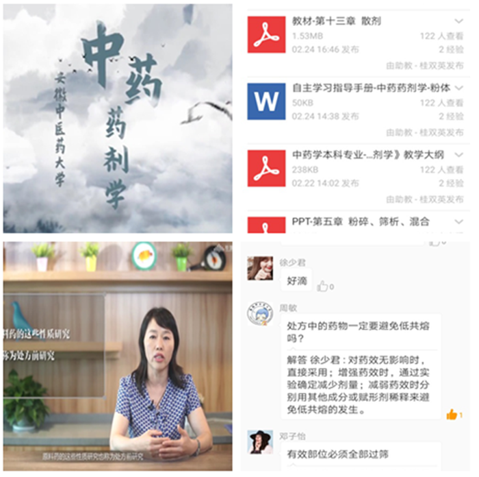 (1)利用学习网络教学平台上省级精品课程《中药药剂学》课程资源(http://mooc1.chaoxing.com/course/201845321.html)、《中药药剂学》精品在线开放课程(https://coursehome.zhihuishu.com/courseHome/2084286#teachTeam)以及云班课上传录播视频、PPT、教材电子稿等线上教学资源,根据课程大纲按周发布课程资源和学习要求,老师线上随时督促员工在线自主学习。