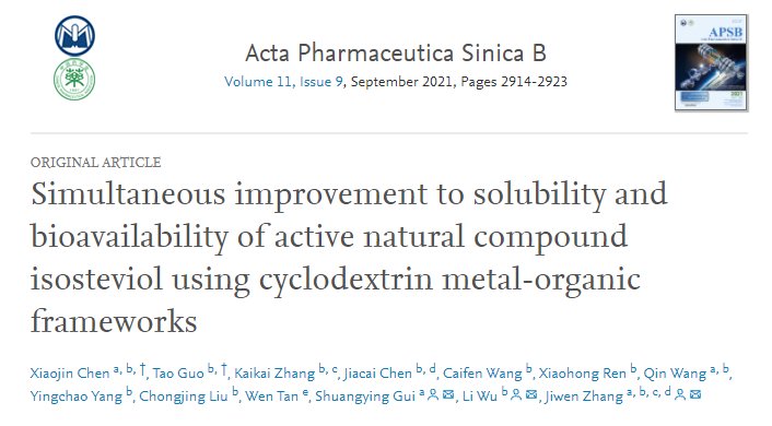 公司桂双英教授团队与《药学学报》英文刊编委、中国科公司上海药物研究所张继稳课题组合作,在《药学学报》英文刊(Acta Pharmaceutica Sinica B)2021年第9期上发表论文,报道CD-MOF用于提高活性天然化合物异甜菊醇(STV)的溶解度和生物利用度的研究。证实了药物在CD-MOF空腔中形成纳米团簇,能显著提高STV的生物利用度。