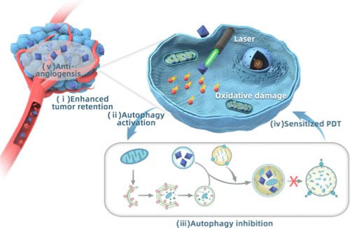 课题组用一种简单有效的方法合成了具有较高胶体稳定性、较长血液循环时间的肝素包涂层的光敏MOF。MOF的多孔结构同时作为PDT的nanoPS和自噬抑制剂(即CQ)的纳米载体。合成的HA/CQ-MOF通过EPR效应实现了更明显的肿瘤靶向能力,实现了肿瘤特异性自噬抑制,降低了CQ的非特异性全身毒性。被癌细胞内化后,HA/CQ-MOF释放的CQ能够使自噬溶酶体碱化,从而阻断自我保护的自噬途径。因此,癌细胞对PDT的敏感性被显著放大。此外,表面肝素层介导的瘤内血管生成反应也有助于提高HA/CQ-MOF介导的PDT的抗肿瘤效果。本研究不仅为纳米MOF提供了一种简单快速有效的表面修饰方法,而且证实了光敏纳米MOF介导的PDT与CQ介导的自噬之间的协同效应。(李丽/文图 胡卿/审核)