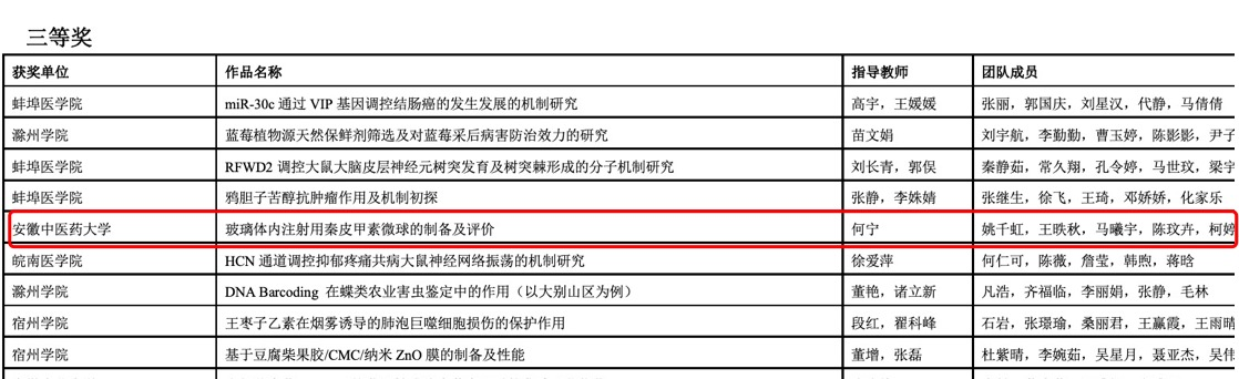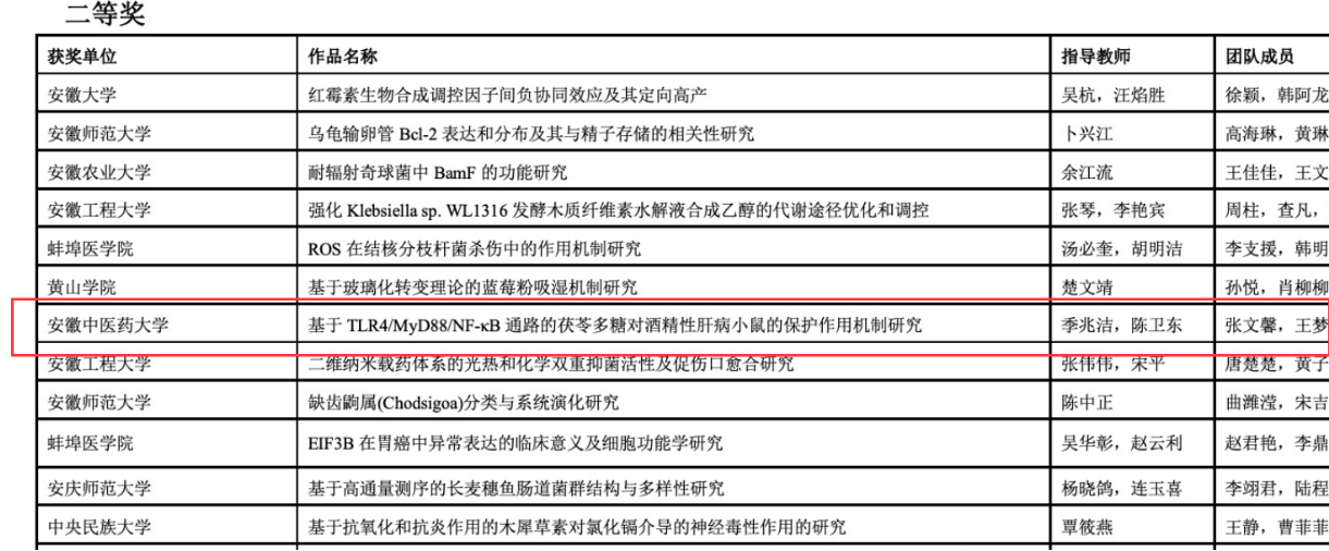 本次竞赛TapTap点点共10支队伍参赛,在指导老师的精心指导下,参赛同学以扎实的理论基础、清晰的逻辑思路、优秀的临场应变能力和良好的精神风貌,获得了评委的一致认可。经过激烈角逐,季兆洁老师、陈卫东教授共同指导的《基于TLR4/MyD88/NF-κB通路的茯苓多糖对酒精性肝病小鼠的保护作用机制研究》(团队成员张文馨、王梦文、田志豪、宋正为)获国家二等奖及省一等奖,何宁教授指导的《玻璃体内注射用秦皮甲素微球的制备及评价》(团队成员:姚千虹、王昳秋、马曦宇、陈玟卉、柯婷)获国家三等奖及省一等奖,陈卫东教授指导的《基于NF-kB通路研究发汗与非发汗丹参对心肌缺血再灌注损伤的保护作用》(团队成员:叶向阳、尹慧慧、陈悦婷、鲁子怡、李玲)以及王茜副教授指导的《黄芩-黄连配伍后黄连对FXR及其调控的OATP1B3和MRPs表达影响研究》(团队成员:梁燕、刘宇洁、崔馨戈、江素萍、吴梦飞)获省三等奖。