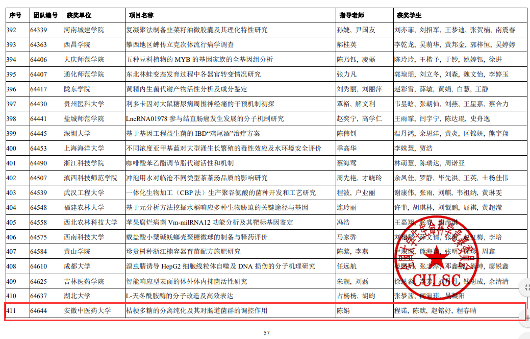 其中,郑峙澐、何宁老师指导的《海绵骨针对阿昔洛韦经皮给药的促渗作用研究》(团队成员李芷萱、王婷婷、晋钊伟、朱宁宁、丁当当)获全国二等奖。陈娟老师指导的《桔梗多糖的分离纯化及其对肠道菌群的调控作用》(团队成员程诺、陈默、赵铭妤、程春晴)获全国三等奖。
