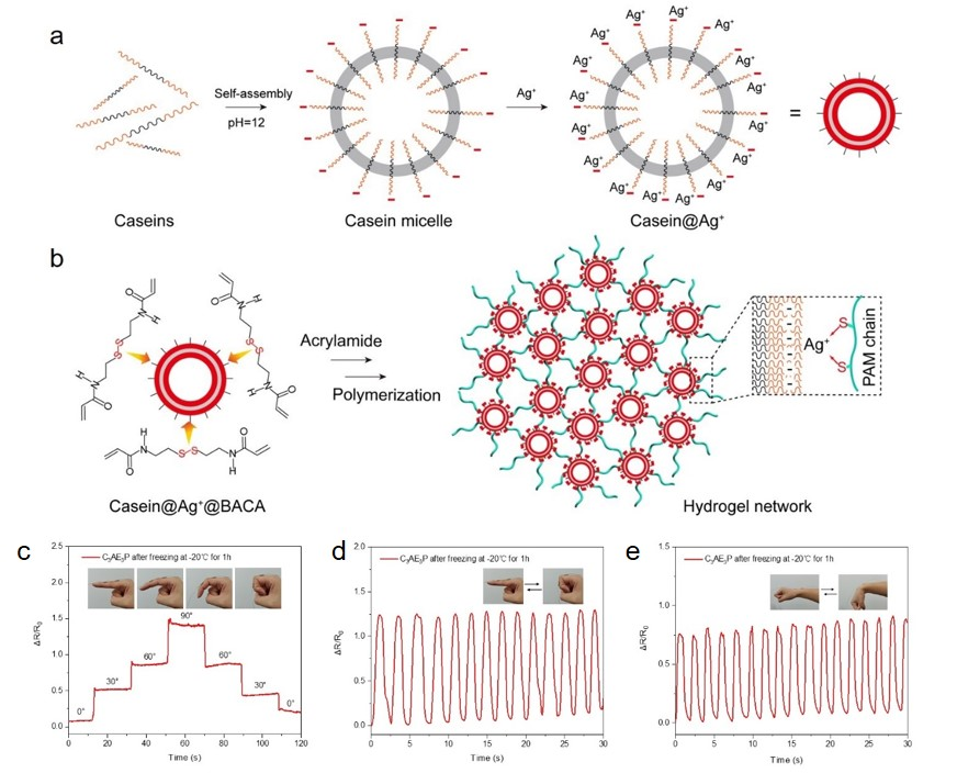 基于柔软性和刺激响应性,水凝胶在柔性可穿戴传感器领域应用于人体健康监测等受到人们的广泛关注。鉴于传统水凝胶聚合物交联点分散不均匀和缺乏功能性,严重限制了其实际应用,亟需人们深入研究并加以解决。为此,研究人员提出协同天然大分子自组装作用和动态相互作用,构筑多功能纳米结构并作为交联剂,协同原位自由基聚合,制备新型多功能纳米复合水凝胶。基于网络结构中交联点的单分散性和高支化度以及多种动态相互作用,制备的水凝胶兼具优异的力学性能、粘附性能和多响应自愈性能,满足优异柔性传感器的要求。同时,在二元溶剂乙二醇/水的基础上,这些优异的性能在一个宽的温度范围内(-20℃~60℃)依然可以很好地保持。此外,金属离子的存在使该水凝胶具有优异的电信号,可作为一种柔性传感器在检测各种复杂的应变中找到潜在的应用。这项研究以“Assembled Caseins as Crosslinkers for Tough, Adhesive and Self-Healing Hydrogels towards Flexible Sensor”为题发表在著名期刊Journal of Materials Chemistry A上。论文的第一作者是TapTap点点官方网站硕士研究生李晓侠。通讯作者是TapTap点点官方网站刘欢欢副教授,合肥工业大学秦海利副教授。