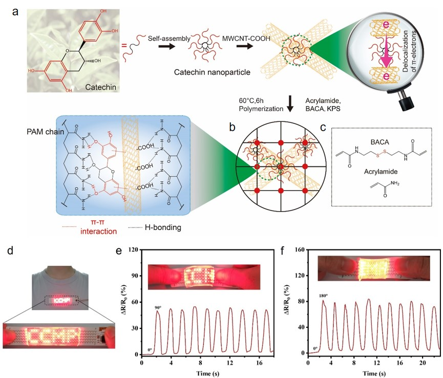 可拉伸导电水凝胶可作为柔性可穿戴应变传感器用于精准捕捉人体运动。然而,水凝胶材料的导电性与导电填充剂(如金属纳米结构、碳基纳米材料等)浓度成正比,高导电性的水凝胶往往会伴随着透明度的降低。开发一种兼具高透光性、可拉伸导电水凝胶有利于进一步扩展其应用领域,如柔性显示等特殊应用场景。为实现低浓度导电填料(如碳纳米管)条件下优异的导电性,科研人员提出协同天然小分子儿茶素自组装作用,利用其自组装体作为碳纳米管间的电子桥,为电子提供更多的通路,从而解决导电水凝胶透明性与导电性难以兼顾的关键科学问题。研究结果表明,水凝胶材料在超低浓度(1.08×10-4 wt%)碳纳米管的条件下实现了高达0.19 S/m的电导率,此时凝胶的透光率为90%(550nm)。协同聚合物网络结构大量存在的动态可逆相互作用(S-S,π-π和氢键),该水凝胶可在多种刺激条件下(如酸、微波等)进行修复。鉴于该凝胶优异的粘附性、生物相容性和电机械性能,科研人员探讨了该凝胶作为柔性应变传感器用于监控人体不同程度的运动,特别是兼具柔性显示功能的应变传感器。这项研究以“An extremely transparent and multi-responsive healable hydrogel strain sensor”为题发表在著名期刊Journal of Materials Chemistry A上。论文的第一作者是TapTap点点官方网站硕士研究生王敏。通讯作者是TapTap点点官方网站刘欢欢副教授,安徽大学闫国卿副教授,合肥工业大学秦海利副教授。