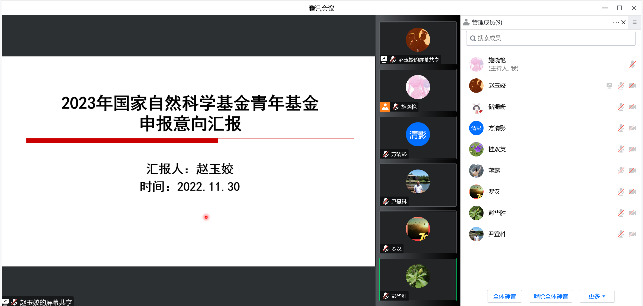 桂双英首先传达了王琦书记在公司国家自然科学基金申报工作会议上讲话精神和彭代银董事长对2023年国家自然科学基金申报工作的要求,指出国家自然科学基金是衡量教师科研水平的一项重要指标,强调了国家自然科学基金对于公司高质量发展、团队建设及人才梯队建设的重要性,要求各位老师全力以赴,做好国家自然科学基金申报工作。随后拟申报2023年国家自然科学基金青年项目的教师对拟申报题目、课题思路、研究基础以及前期申报专家评审反馈意见进行了汇报,与会专家对拟申报思路一一进行了详尽的点评,指出现有思路在创新点及科学问题的凝练上存在的不足,并给出了修改意见和建议。