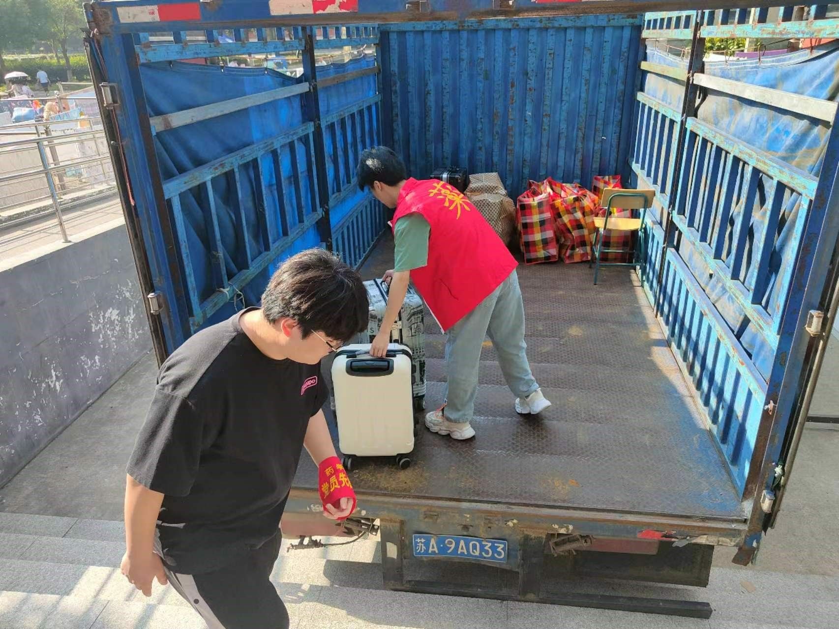 早上7点半,所有志愿者在北区宿舍楼集合,开始分配工作。北宿舍志愿者负责将员工的行李打包装车,南宿舍志愿者负责卸下行李,并帮助同学搬运至宿舍。