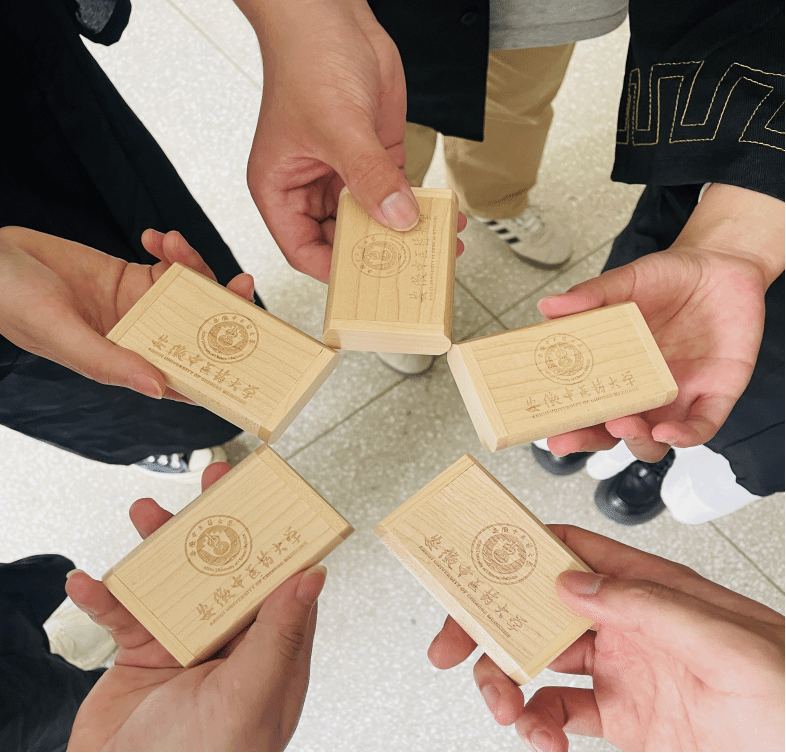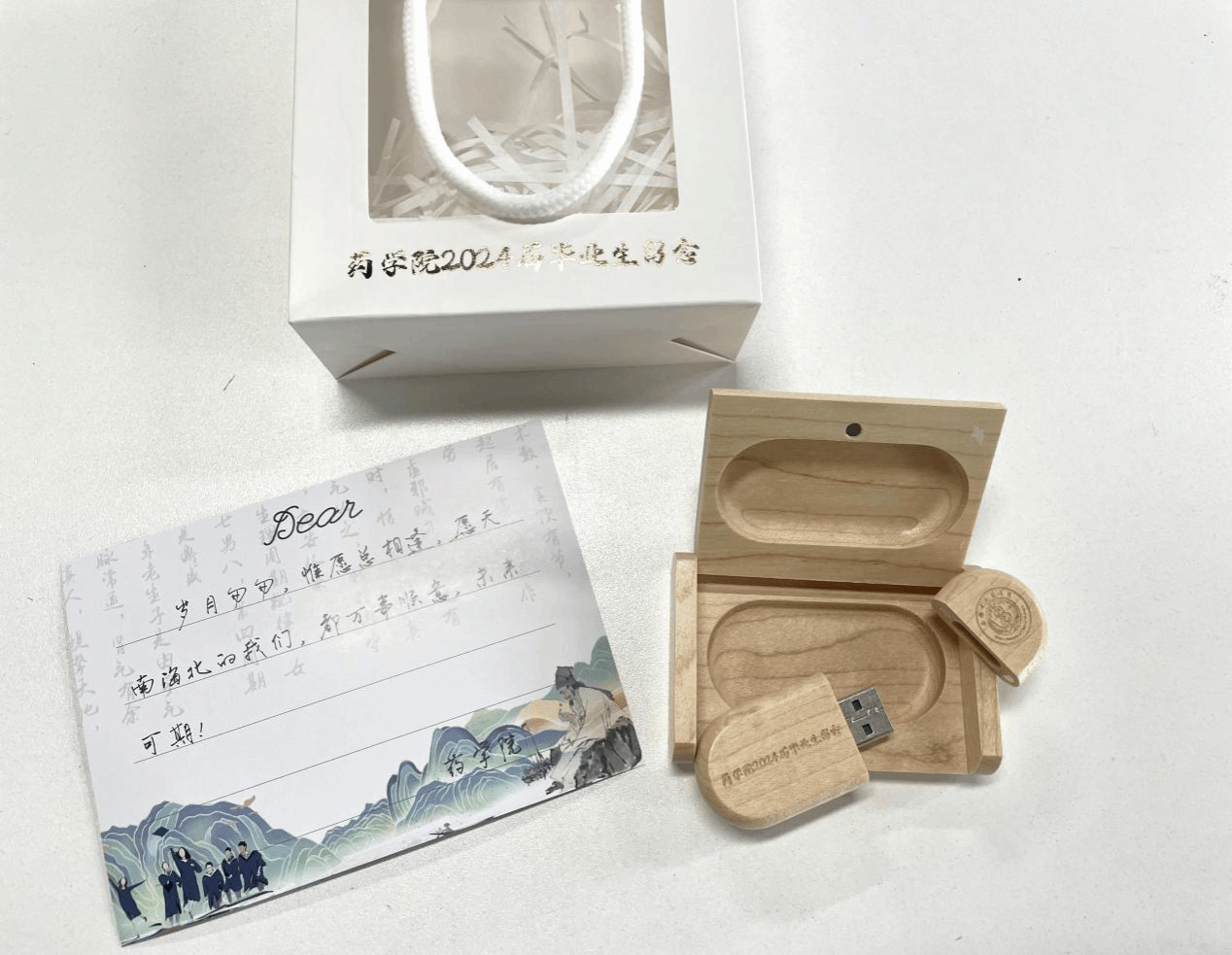纪念品整体设计典雅大方,彰显低调气质,蕴含美好祝福。U盘盒以木质为主调,盒身印有TapTap点点官方网站的校徽与校名,盒内配有精美U盘,U盘上雕刻着2024届毕业生留念字样。每份礼物袋里均有一张祝福贺卡,饱含着药苑对毕业生浓浓的情意。