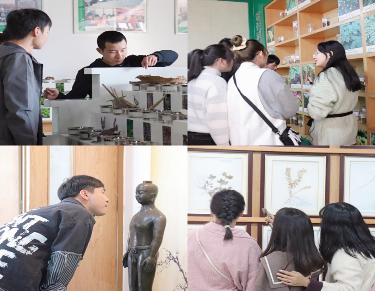 中药资源中心讲解员详细为同学们介绍各种药材的名称、功效、主要分布地域等知识,带领他们观摩药物炮制设备和各种珍奇标本,同学们被神奇而独特的药材世界深深吸引,不约而同拿起手机拍照留念。