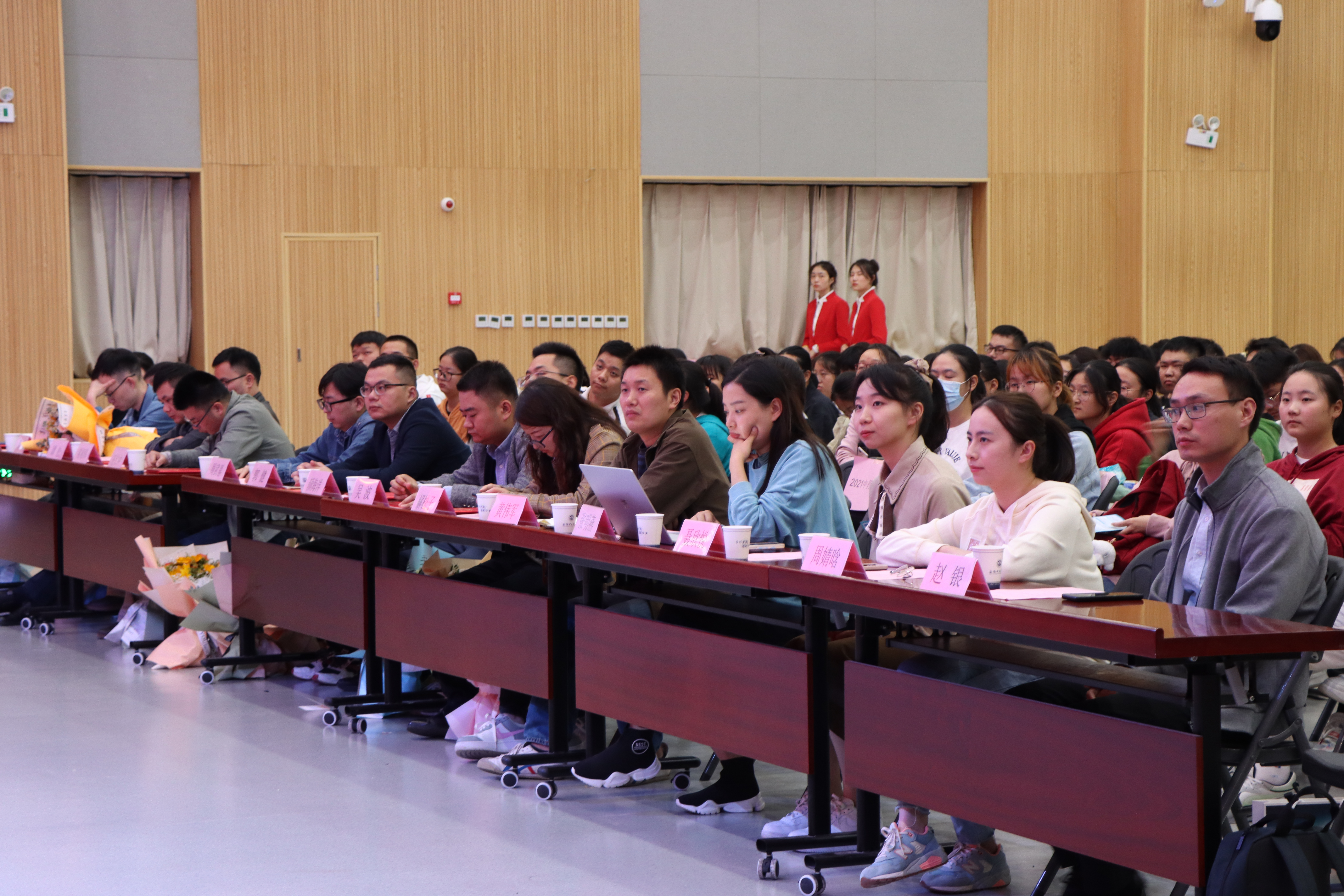 徐先韬宣读2021级新生班班主任聘任文件,感谢新聘任的11名新生班班主任对员工工作的关心和支持。大会向2021级新生班班主任颁发聘书,各班级员工代表向班主任献花。