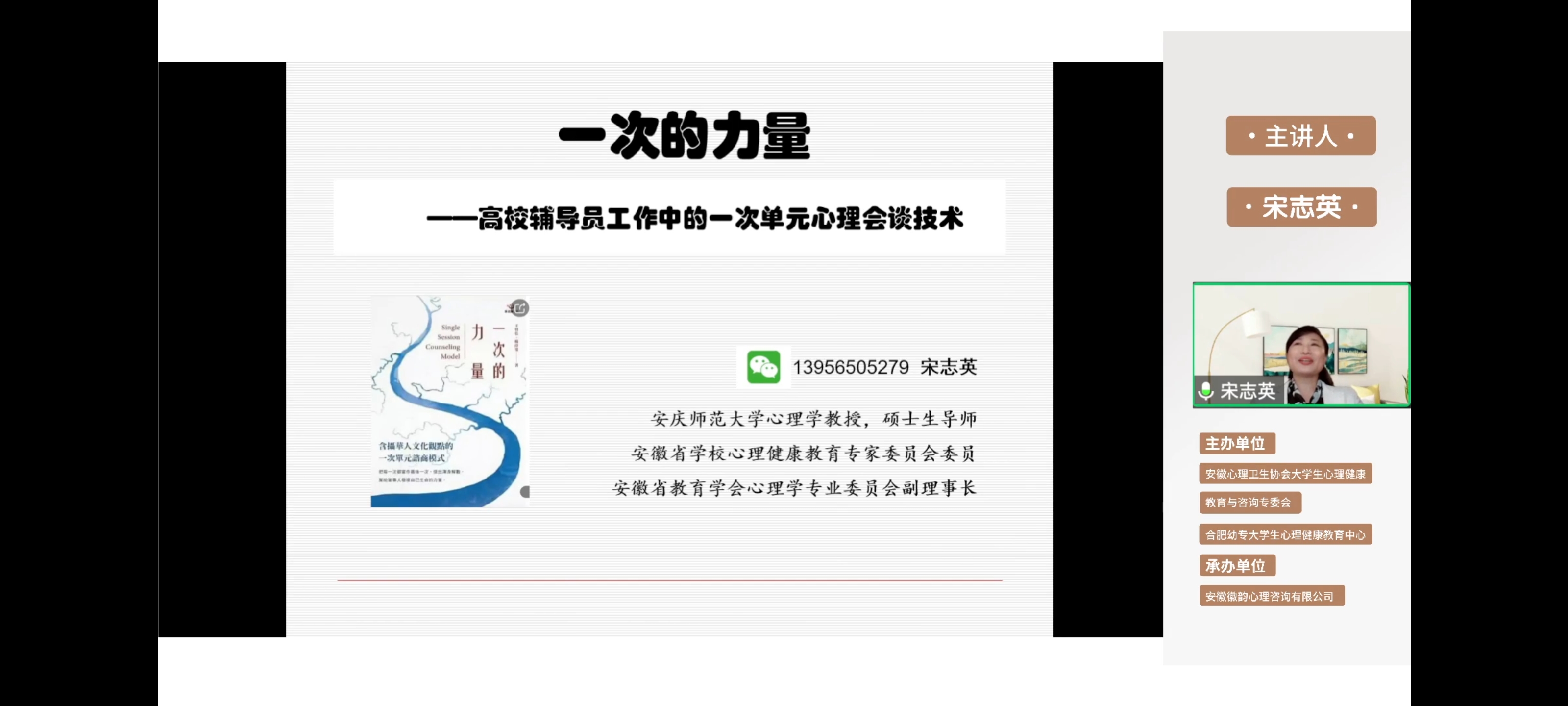4月5日晚7点,TapTap点点全体专兼职辅导员参加了安庆师范大学心理学教授宋志英主讲的《一次的力量——高校辅导员工作中的一次单元心理会谈技术》线上讲座,此次讲座由安徽心理卫生协会老员工心理健康教育与咨询专委会、合肥幼专老员工心理健康教育中心主办。