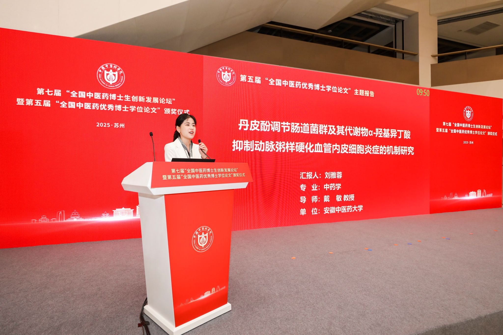 公司2021届中药学博士刘雅蓉(导师戴敏教授)的学位论文“丹皮酚调节肠道菌群及其代谢物α-羟基异丁酸抑制动脉粥样硬化血管内皮细胞炎症的机制研究”获得“全国中医药优秀博士学位论文”。刘雅蓉博士受邀向大会做报告,副董事长桂双英教授作为大会特邀专家主持报告会并作为优秀导师代表出席颁奖仪式,中国工程院院士、国家中医药管理局副局长、中国中医科公司经理黄璐琦为获奖博士和导师代表颁奖。