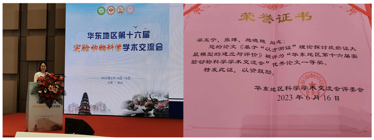 2023年6月14-16日,戴敏教授导师团队指导的2021级硕士研究生梁玉宁参加了由于江苏省实验动物协会主办、苏州市实验动物协会承办的华东地区第十六届实验动物科学学术交流会,并作题为《基于“以方测证”理论探讨痰瘀证大鼠模型的建立与评价》的学术交流并获得大会优秀论文一等奖。