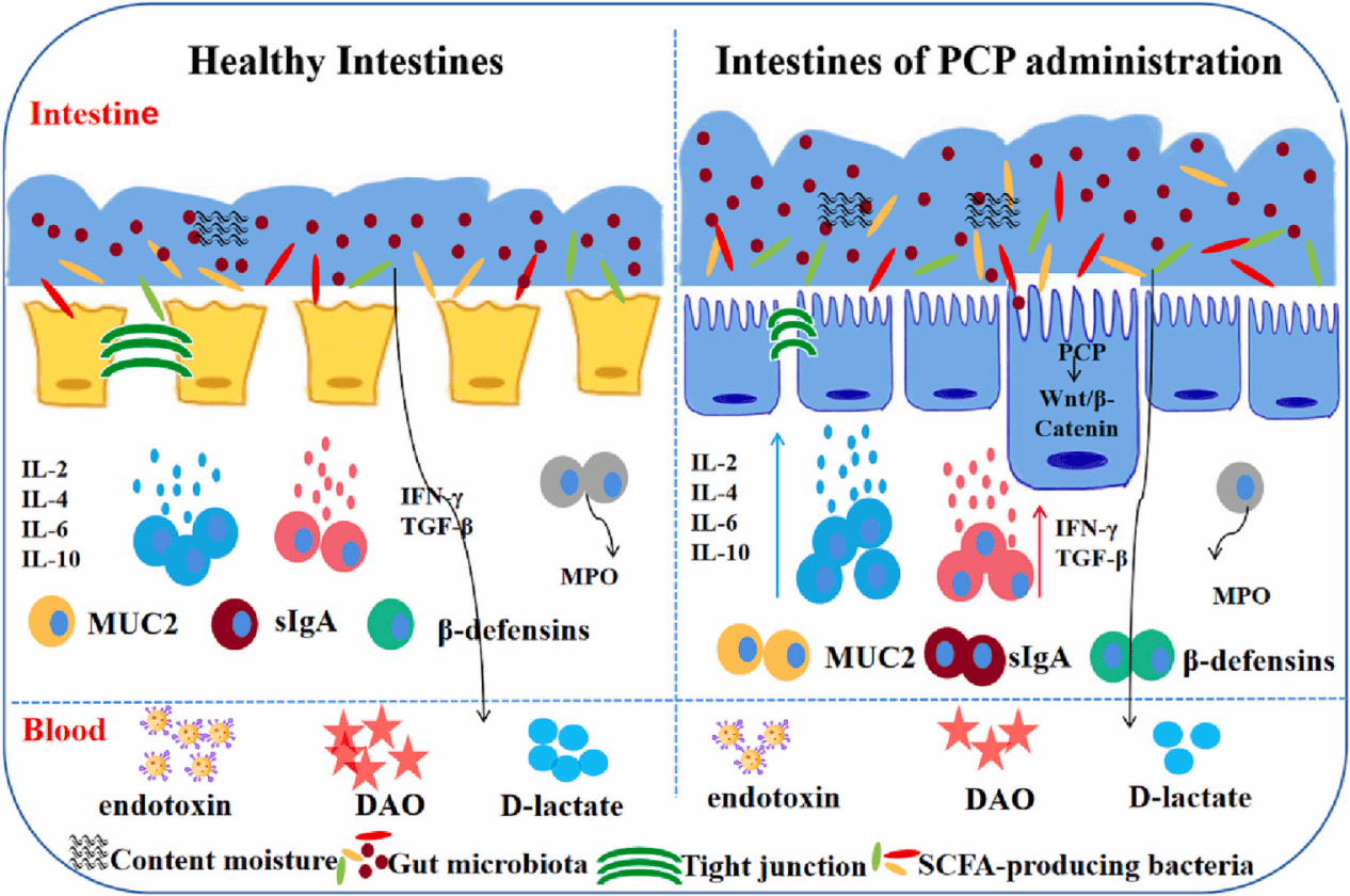茯苓因其“健脾”作用在中医临床中应用广泛,素有“十方九苓”之说,但其健脾功效机制尚未明确。中医的“脾主运化”包含了人体对饮食物消化吸收的整个过程,涵盖了如胃、小肠、大肠等脏腑功能。“茯苓研究团队”最新研究发现茯苓多糖可以通过调节肠道微生物群,进而调节短链脂肪酸(SCFAs)代谢和其介导的Wnt/β-catenin途径改善小鼠肠道(十二指肠、空肠和回肠)的生理状态、物理、生化、免疫和微生物屏障功能。该研究结果表明茯苓多糖可以预防肠道相关疾病的发生,如肠易激综合征,炎症性肠病和结肠癌等,为茯苓多糖作为益生菌或功能性食品药物的功能活性提供了理论依据,同时也有助于阐明茯苓“健脾”功效的科学内涵。