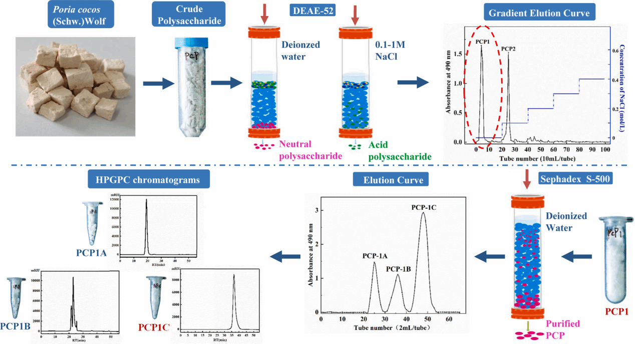 《金匮要略》云:“见肝之病,知肝传脾,当先实脾”。茯苓因其调和肝脾的功效而常用于治疗肝病。“茯苓研究团队”以保肝活性为导向,从茯苓菌核中分离纯化出其发挥预防CCl4诱导肝损伤作用的主要活性组分茯苓多糖PCP-1C。结构分析表明, PCP-1C是由半乳糖、葡萄糖、甘露糖和岩藻糖(摩尔比43.5: 24.4: 17.4: 14.6)组成的1,6-α-D-Galp线性主链的半乳葡聚糖。“茯苓研究团队”从核受体和代谢酶的角度初步阐明PCP-1C是通过调控组成型雄甾烷受体(CAR)的表达和下调细胞色素P450酶CYP2E1活性实现对CCl4诱导肝损伤的保护作用。该研究首次纯化茯苓多糖中一个均一多糖PCP-1C,初步解析出该PCP-1C是由半乳糖、葡萄糖、甘露糖和岩藻糖组成,并探明该PCP-1C具有保肝活性,为未来茯苓多糖产业化研究奠定基础。