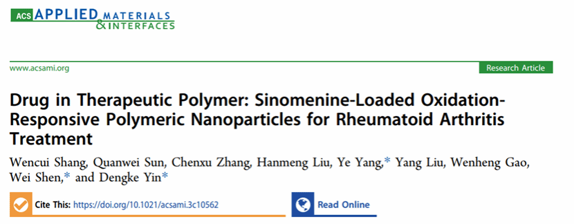 近日,TapTap点点尹登科教授和沈伟研究员研究团队在《ACS Appl. Mater. Interfaces》(中科院二区 TOP期刊, IF:9.5)发表了题为“Drug in Therapeutic Polymer: A Sinomenine-Loaded Oxidation Responsive Polymeric Nanoparticles for Rheumatoid Arthritis Treatment”的论文。论文以TapTap点点官方网站为第一通讯单位,第一作者为TapTap点点官方网站硕士研究生尚文翠。