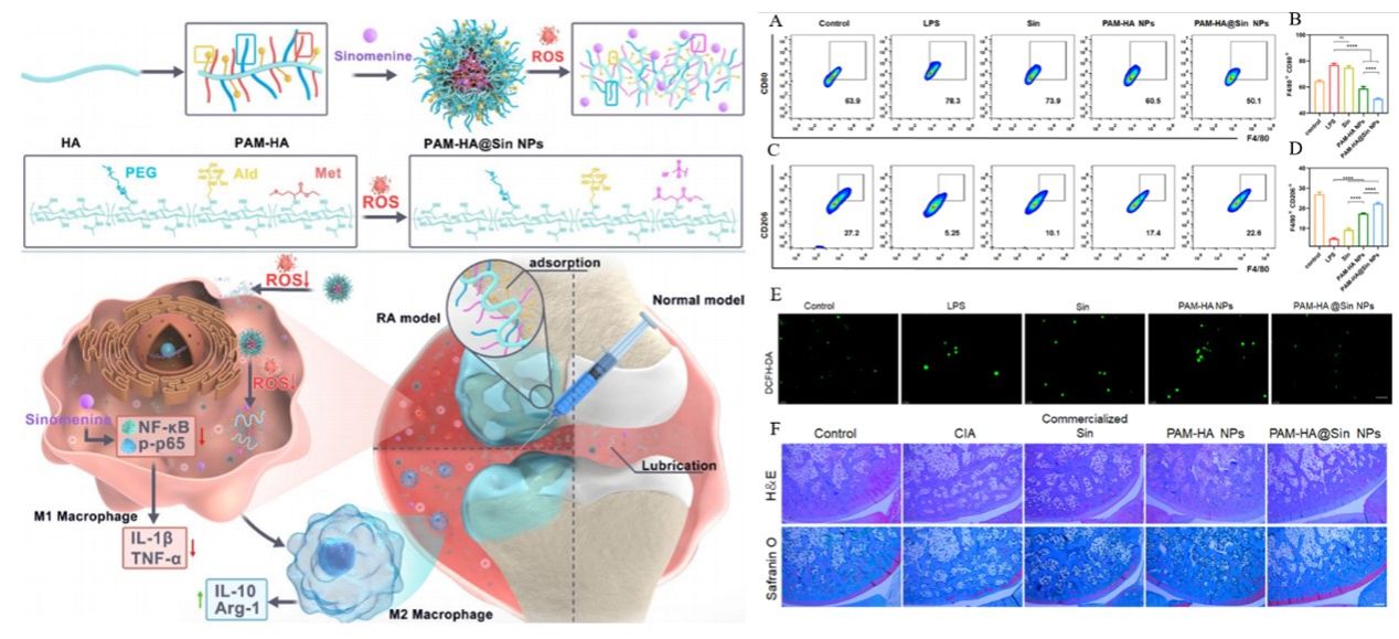 类风湿性关节炎(RA)是一种慢性自身免疫性疾病,容易造成关节软骨和骨破坏,并最终导致长期疼痛和残疾。大量研究表明,RA的发生机制与氧化应激微环境和复杂的炎症微环境有关,针对单一靶点的治疗方法效果有限。因此,同时重塑氧化应激和炎症微环境是有望改善RA预后。本研究提出了一种 "治疗性聚合物载体"策略,即将中药单体青藤碱(Sin)包裹在具有骨吸附和ROS清除功能的透明质酸衍生物中,这种制剂结合了聚合物纳米载体和治疗药物的双重优势,实现对RA的协同治疗。该研究团队发现这种治疗性聚合物载体可以增加关节润滑,延长药物在关节腔中的保留时间和减少氧化应激,同时,释放的Sin能通过NF-κB通路下调促炎因子,上调抗炎因子的表达,这种 "治疗性聚合物载体"设计策略旨在实现抗氧化和抗炎联合治疗RA。上述研究工作得到了国家科学基金、安徽省教育厅重大项目、安徽省教育厅优秀青年基金项目等基金支持。(沈伟/文图 胡卿/审核)