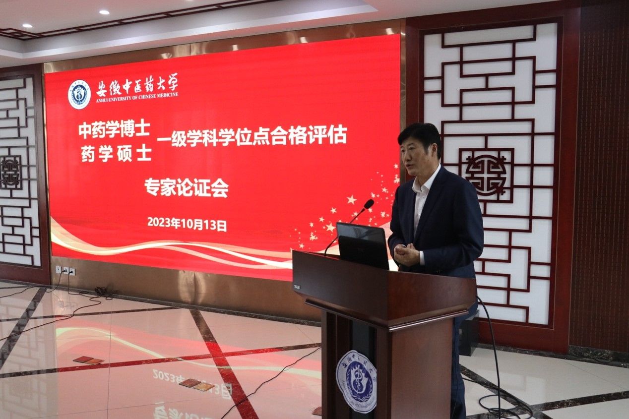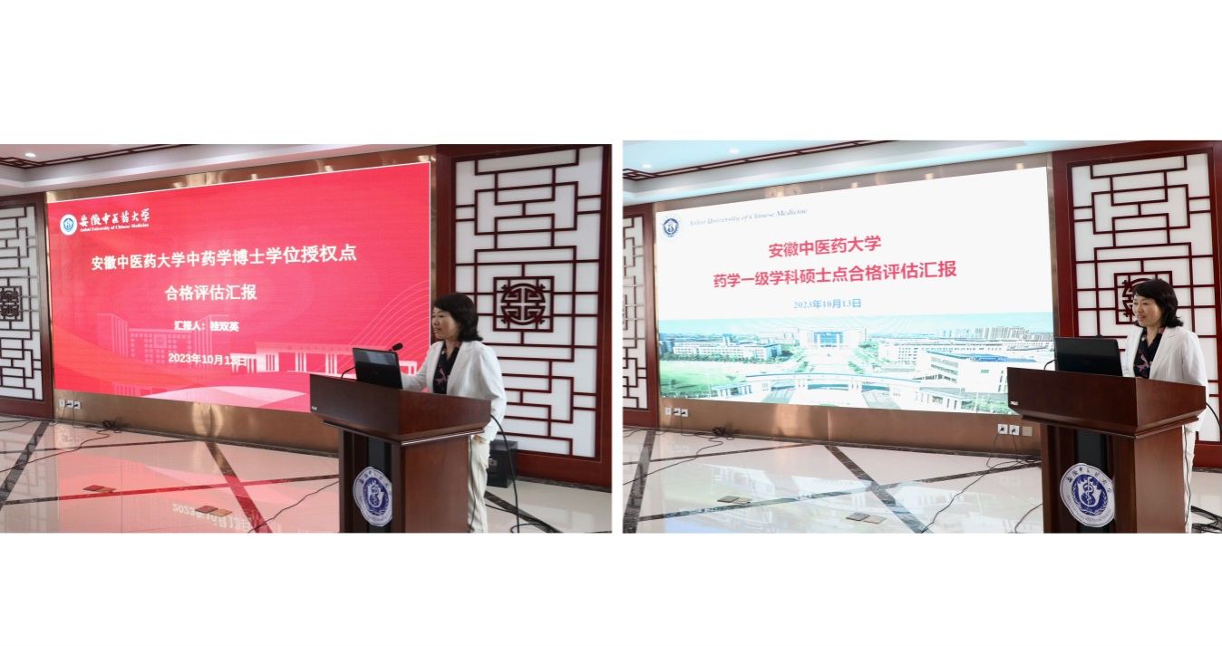 桂双英汇报了中药学一级学科博士学位点、药学一级学科硕士点合格评估自查情况,介绍了学位授权点发展历程、建设内容与成效、管理体系与保障情况以及存在的问题与对策。
