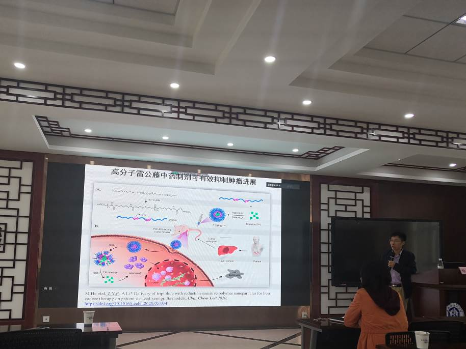此外,在中药方面,喻志强教授将雷公藤甲素与光敏分子、高分子载体结合制备成新型制剂,大大降低了雷公藤甲素的毒性,为中药的应用提供了可行性方案。喻教授的报告内容精美条理清晰,让在场的师生获益匪浅。