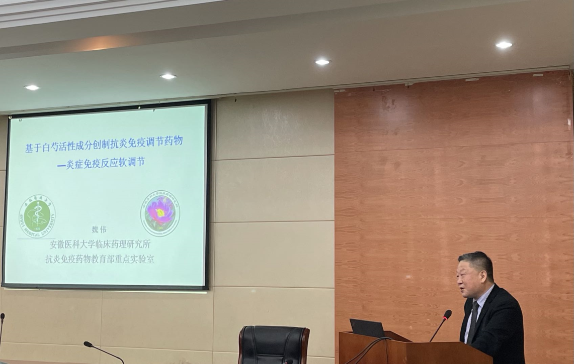 魏伟教授作“基于白芍活性成分创制抗炎免疫调节药物—炎症免疫反应软调节”的报告,从白芍-白芍总苷-芍药苷-CP-25、聚焦自身免疫病治疗需要创制新药、炎症免疫反应软调节等方面介绍了课题组三十多年来以十大皖药之白芍有效成分的新药研究与开发的历程及成果。