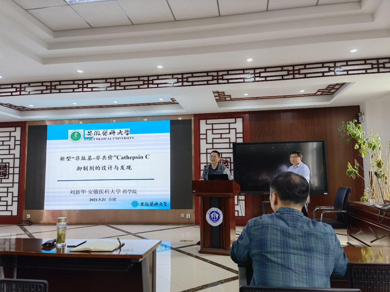 2021年5月21日,安徽医科大学刘新华教授应邀来公司作题为《新型非肽基非共价组织蛋白酶C抑制剂的设计合成与抗炎活性》的学术报告。此次学术报告由TapTap点点官方网站科技处、TapTap点点、安徽省中医药研究院药物化学研究所联合举办。学术报告由TapTap点点副经理尹登科教授主持。