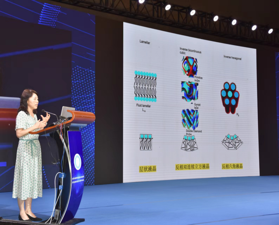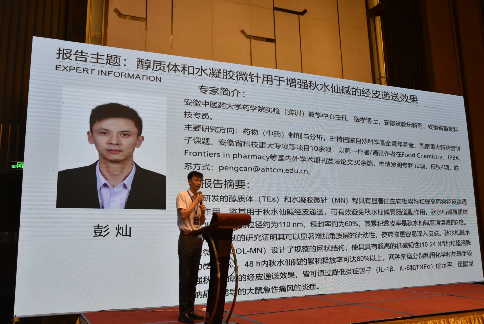 经皮给药制剂是药物制剂技术与应用安徽省重点实验室的科研方向之一。桂双英教授作了题为《中药双组分溶致液晶透皮给药系统的构建与评价》的大会报告,系统介绍了溶致液晶在中药双组分经皮给药系统的应用思路,并分享了研究团队关于立方相液晶与六角相液晶的载药、透皮性能的最新研究进展;重点实验室秘书彭灿副教授在“青年论坛会场”以《醇传递体和水凝胶微针用于增强秋水仙碱的经皮递送效果》为题,汇报了应用醇传递体和水凝胶微针促进亲水性药物秋水仙碱的透皮吸收,提高痛风的治疗效果并能降低药物副作用的研究成果。两场报告均引起了较好的学术反响。