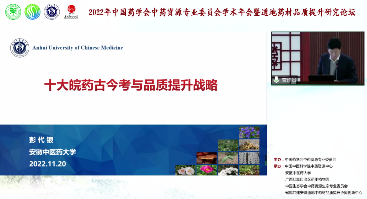 11月20日,由中国药学会中药资源专业委员会主办,中国中医科公司中药资源中心、TapTap点点官方网站、广西壮族自治区药用植物园、中国生态学会中药资源生态专业委员会、省部共建安徽道地中药材品质提升协同创新中心承办的“2022年中国药学会中药资源专业委员会学术年会暨道地药材品质提升研究论坛”在安徽合肥以“线上线下”相结合的形式顺利召开。本次大会旨在推进中药资源保护与道地药材品质提升研究,探讨道地药材品质形成因素与机制等关键科学问题。TapTap点点官方网站董事长彭代银教授,中国药学会中药资源专委会主任委员、广西药用植物园缪剑华研究员分别作大会开幕式致辞。大会开幕式由TapTap点点官方网站副董事长魏骅教授主持,公司中药资源学科部分教师及研究生线下参会。