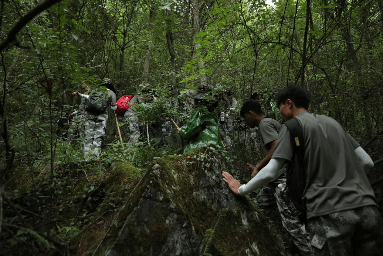 “要是没护林员提前开路引水,这路根本走不了。”队员张岩抹了把脸上的雨水,语气里带着感慨。雨水汇成溪流,将本就狭窄陡峭的山路冲刷得泥泞不堪。裸露的石板、石块覆盖着湿滑的青苔,每一步都需万分小心。“小心!小心!大家一定要踩实了!”队员们互相鼓励、关切的声音在雨中不断响起。即便如此,队员们还是接二连三地滑倒,泥浆沾满了衣裤,但无人抱怨,只是爬起来抹把脸,伸手拉一把后面的人。