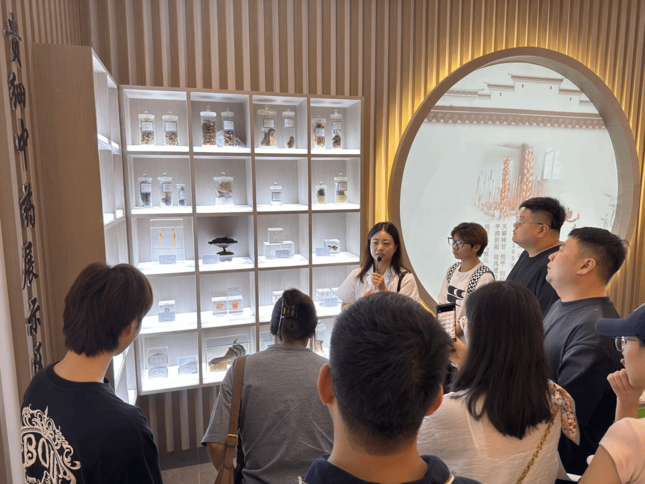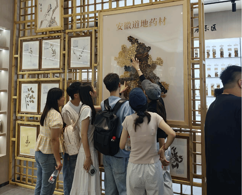 活动现场,同学们首先来到了中药标本馆。跟随研究院讲解员的脚步,了解了安徽丰富的中药资源。从 “南新安,北华佗” 的中医文化传承,到省内不同区域的特色中药材,结合超高精数字化药材模型系统,同学们对于安徽省道地药材有了更为深入的了解。随后,走进安徽地产药材展示区。霍山石斛、黄精、天麻等 15 味中药材标本映入眼帘,中药标本在灯光下的展示盒中熠熠生辉,凸显精致。